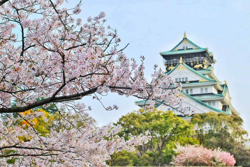Lâu đài Osaka (chụp hình bên ngoài): Tòa lâu đài có kiến trúc cổ kính, trang nghiêm và lộng lẫy giữa những tán cây hoa anh đào trong mùa hoa nở rực rỡ. Khiến cho cảnh vật và thiên nhiên như thêm phần kiều diễm hơn.
